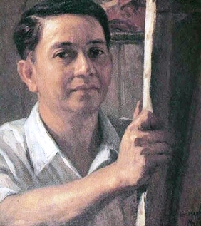 Detail from Fernando Amorsolo's 1945 Defence of a Filipina Woman's Honour, which is representative of Amorsolo's World War II-era paintings. Here, a Filipino man defends a woman, who is either his wife or daughter, from being raped by an unseen Japanese soldier. Note the Japanese military cap at the man's foot
